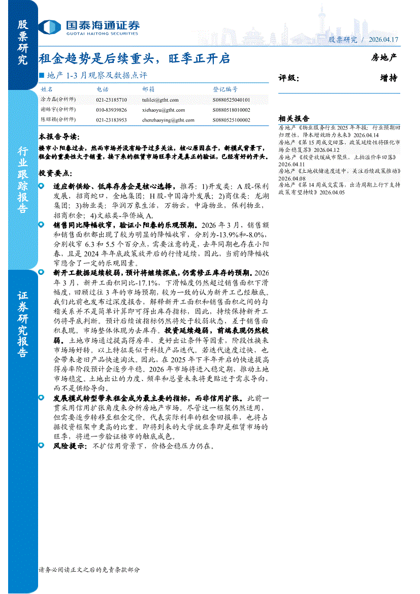 房地产行业:国泰海通证券-房地产行业地产1~3月观察及数据点评:租金趋势是后续重头,旺季正开启-260417