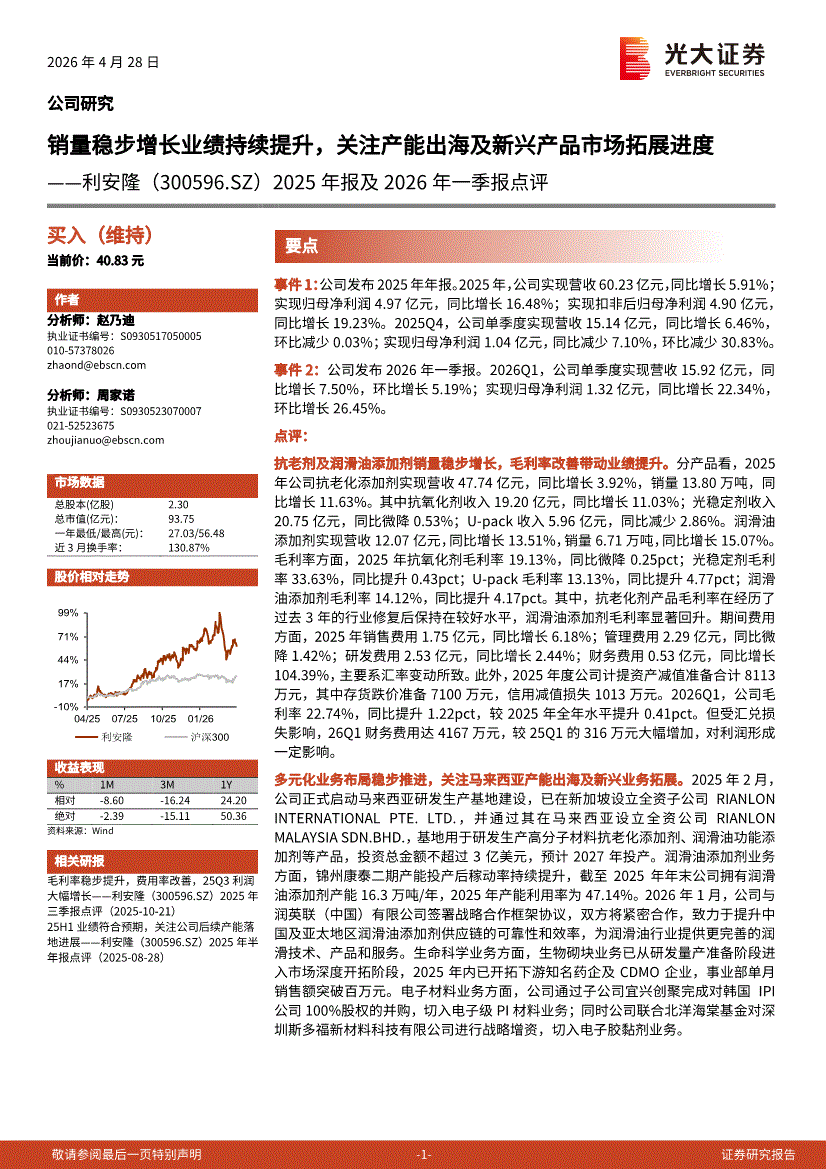 利安隆:光大证券-利安隆-300596-2025年报及2026年一季报点评:销量稳步增长业绩持续提升,关注产能出海及新兴产品市场拓展进度-260428