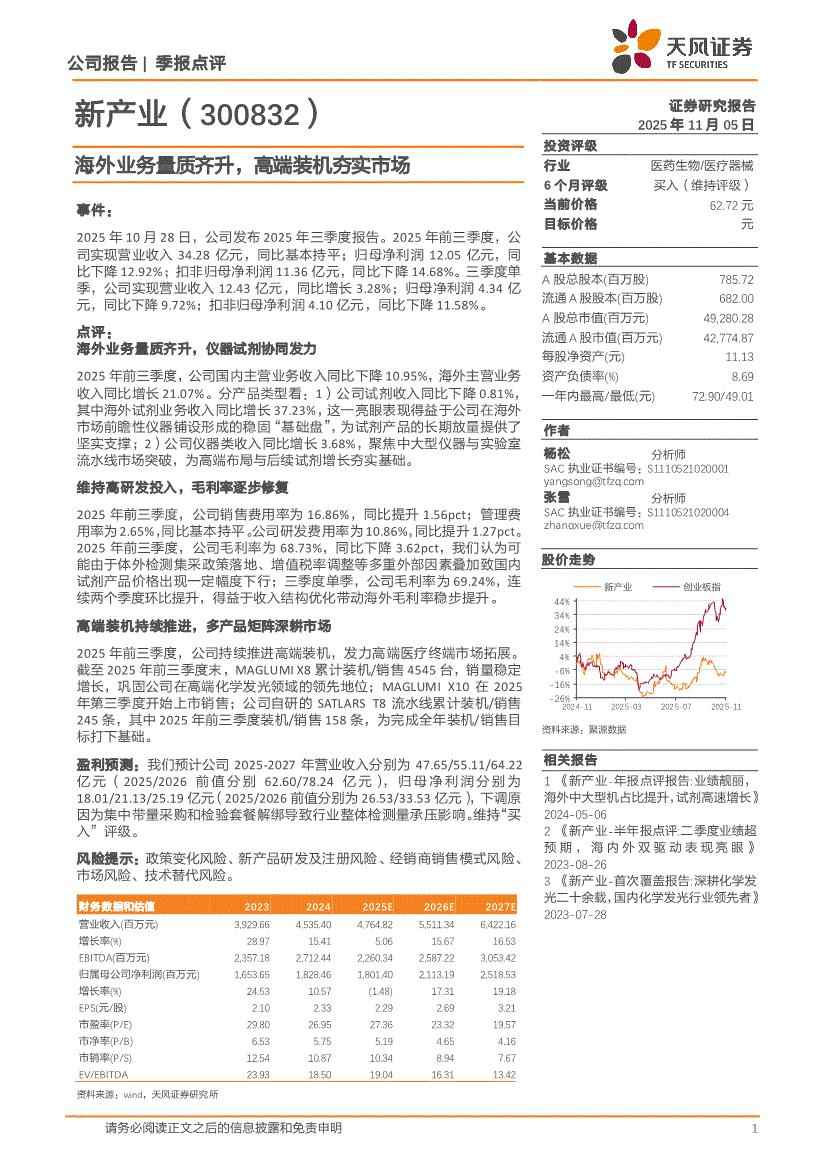 新产业:天风证券-新产业-300832-海外业务量质齐升,高端装机夯实市场-251105