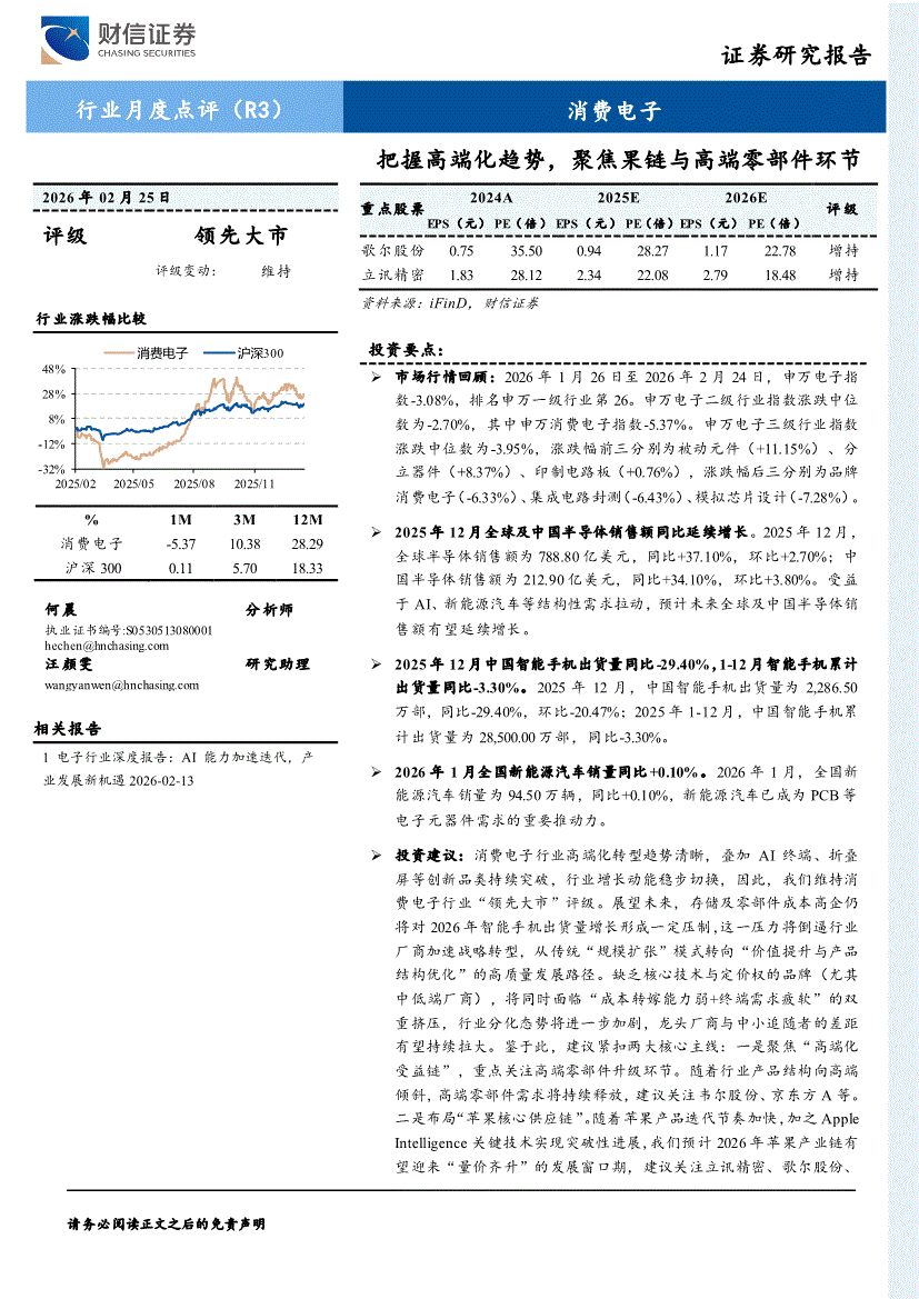 消费电子行业:财信证券-消费电子行业:把握高端化趋势,聚焦果链与高端零部件环节-260225