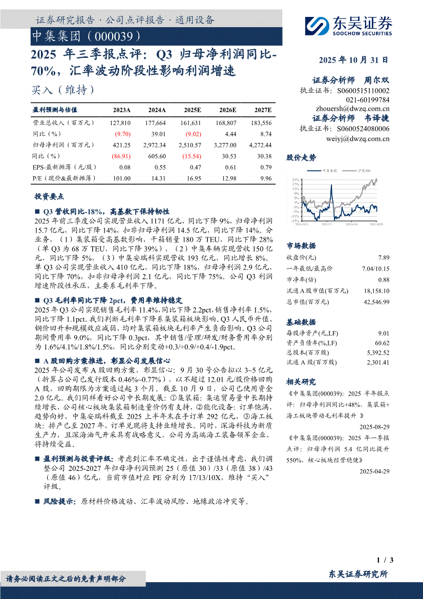 中集集团:东吴证券-中集集团-000039-2025年三季报点评:Q3归母净利润同比下降70%,汇率波动阶段性影响利润增速-251031