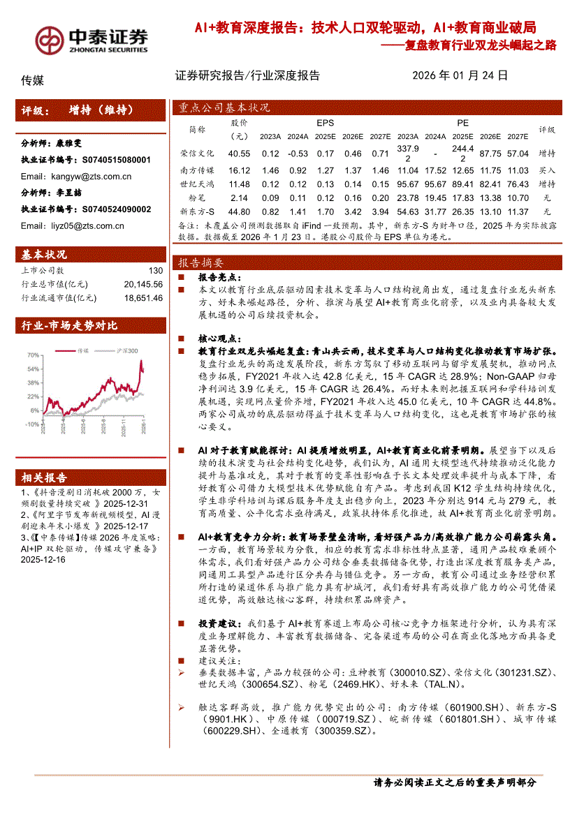 复盘教育行业:中泰证券-复盘教育行业双龙头崛起之路:AI+教育深度报告,技术人口双轮驱动,AI+教育商业破局-260124