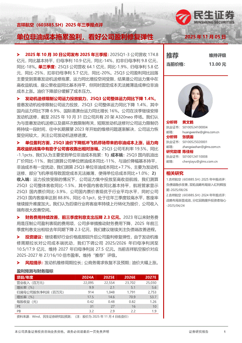 吉祥航空:民生证券-吉祥航空-603885-2025年三季报点评:单位非油成本拖累盈利,看好公司盈利修复弹性-251105