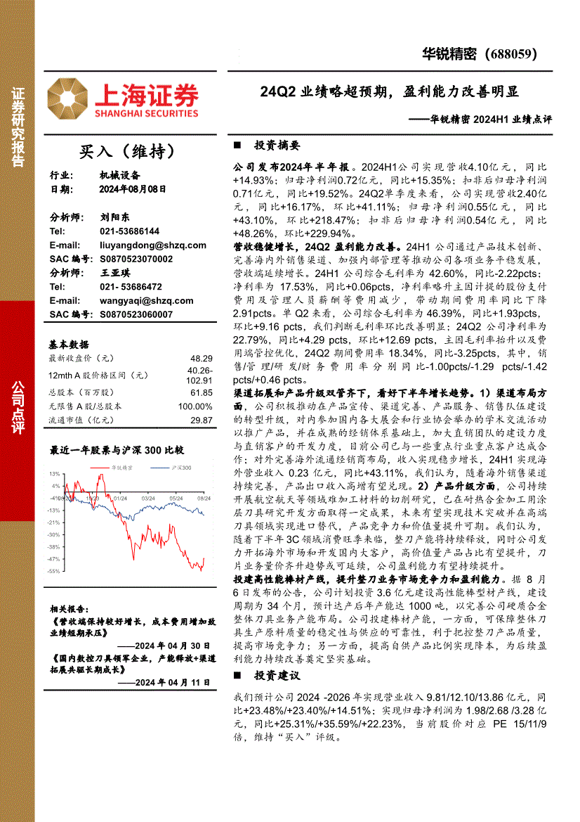 华锐精密:上海证券-华锐精密-688059-华锐精密2024H1业绩点评:24Q2业绩略超预期,盈利能力改善明显-240808
