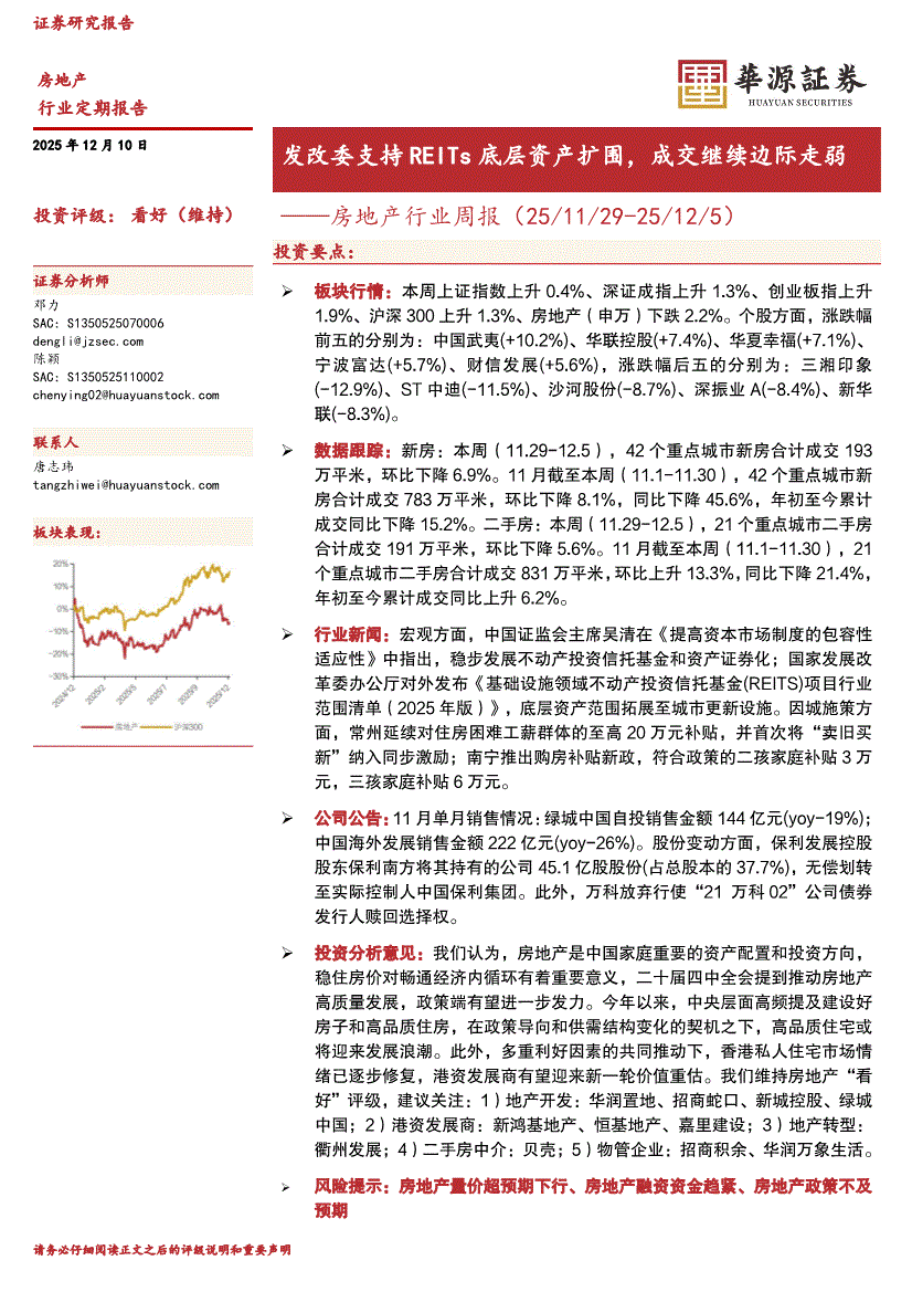 房地产行业:华源证券-房地产行业周报:发改委支持REITs底层资产扩围,成交继续边际走弱-251210