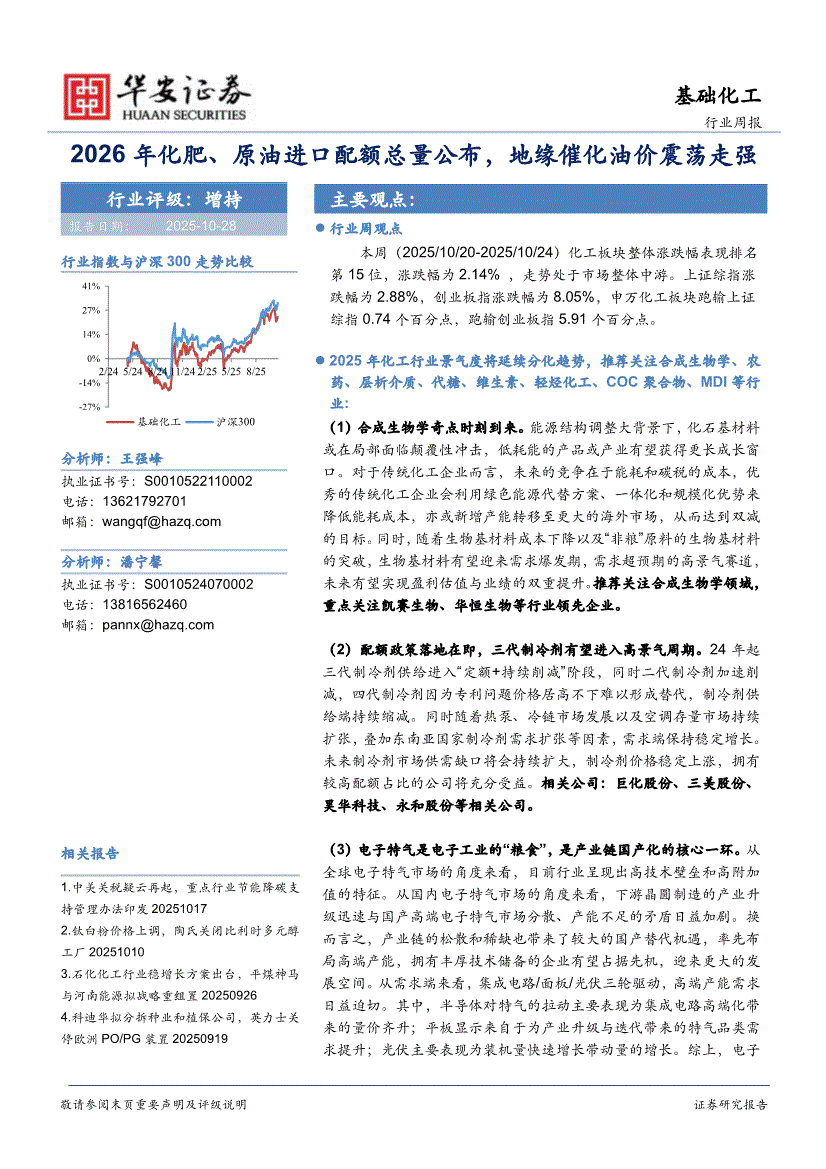 基础化工行业:华安证券-基础化工行业周报:2026年化肥、原油进口配额总量公布,地缘催化油价震荡走强-251028