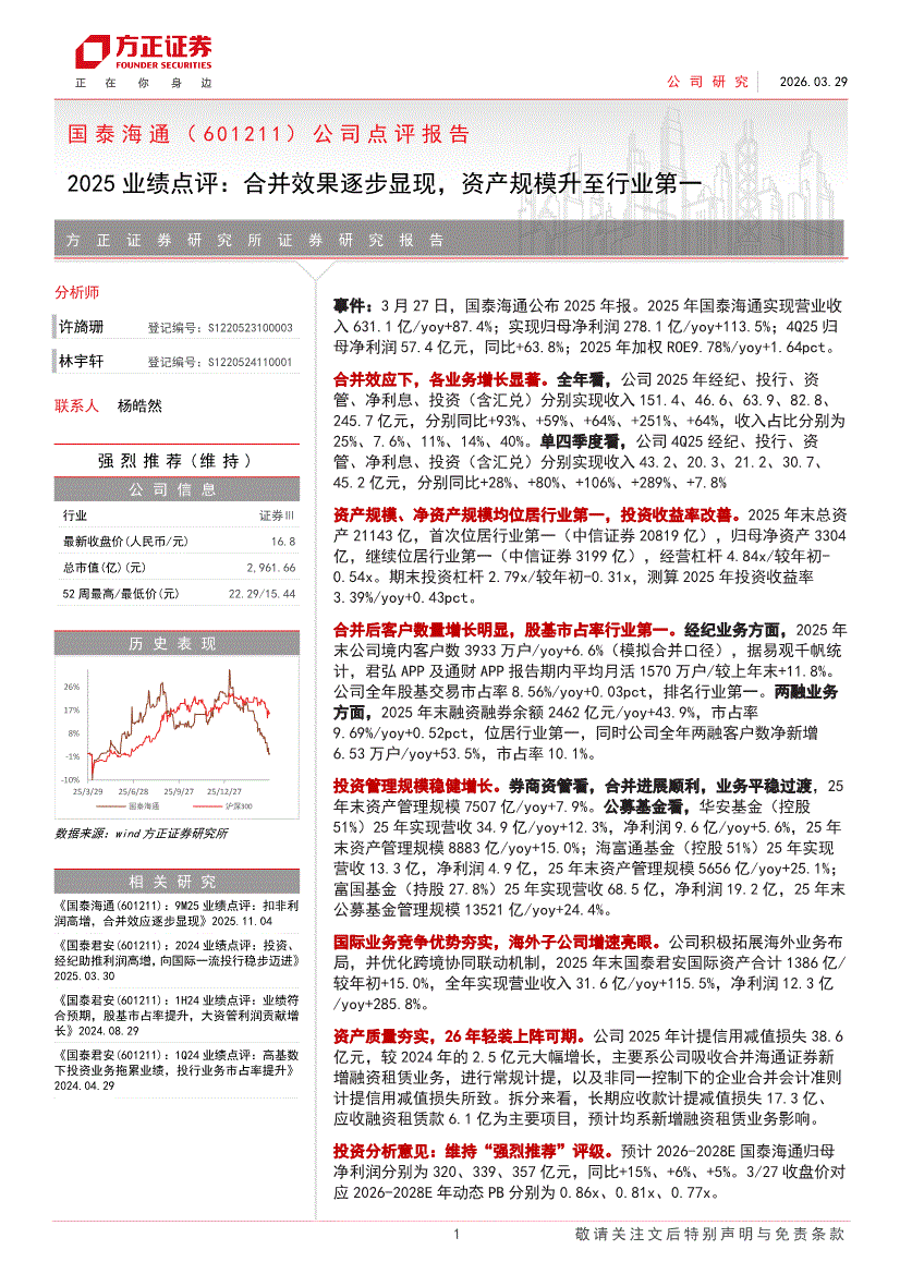 国泰海通:方正证券-国泰海通-601211-2025业绩点评:合并效果逐步显现,资产规模升至行业第一-260329