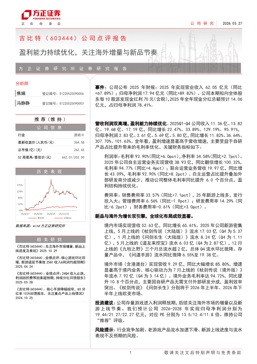 方正证券-吉比特-603444-公司点评报告:盈利能力持续优化,关注海外增量与新品节奏-260327