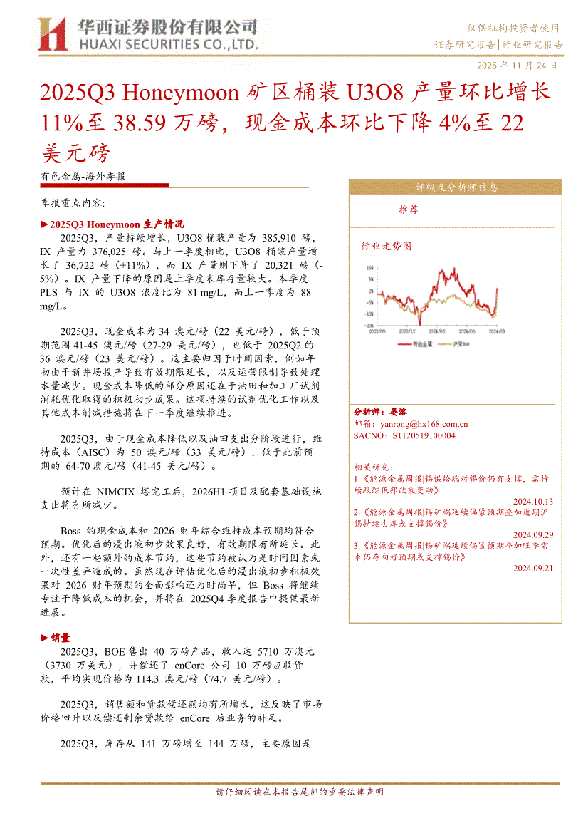 有色金属行业:华西证券-有色金属行业~海外季报:2025Q3 Honeymoon矿区桶装U3O8产量环比增长11%至38.59万磅,现金成本环比下降4%至22美元磅-251124