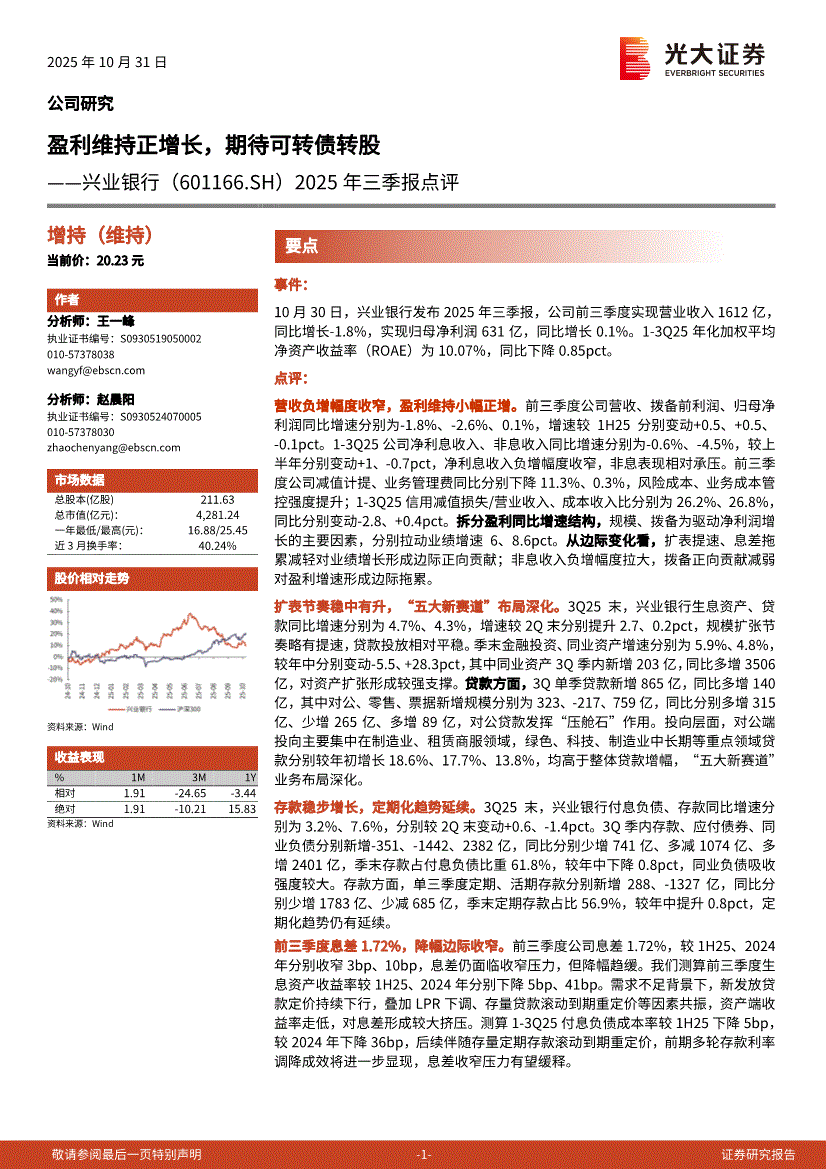 兴业银行:光大证券-兴业银行-601166-2025年三季报点评:盈利维持正增长,期待可转债转股-251031