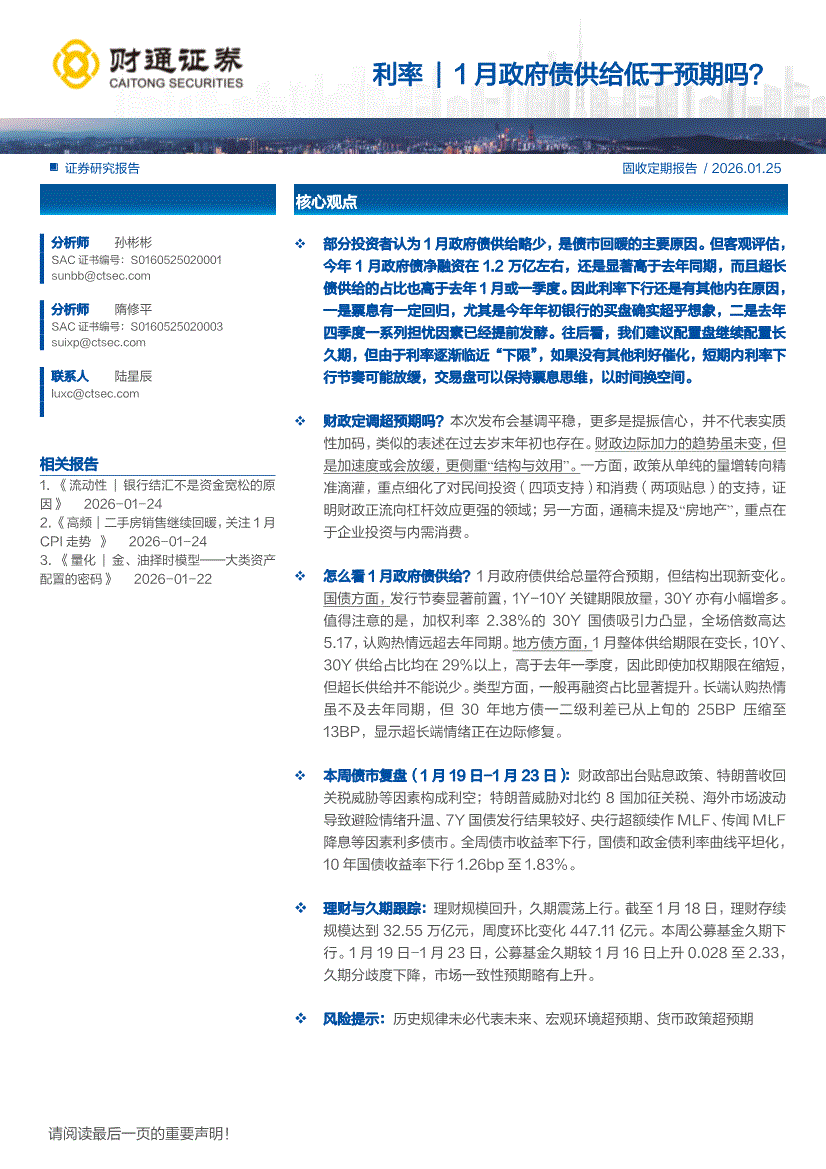 财通证券-利率| 1月政府债供给低于预期吗?-260125