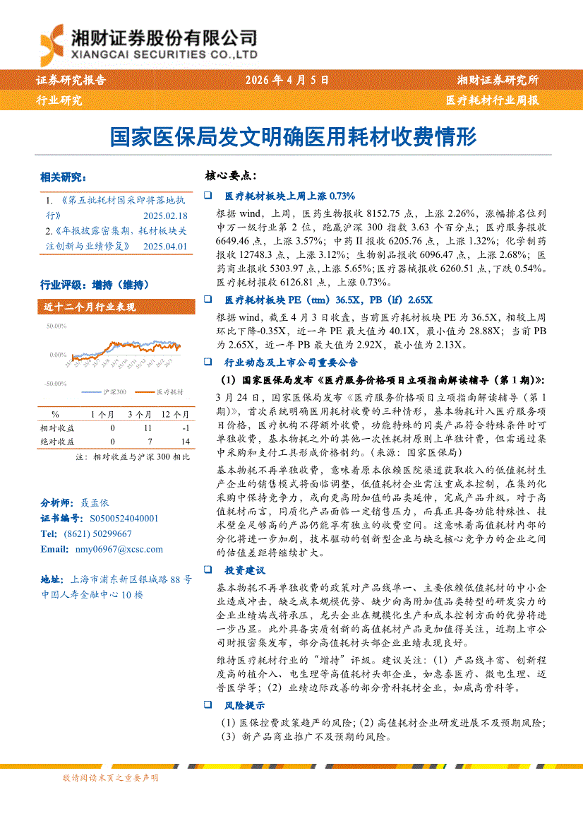 医疗耗材行业:湘财证券-医疗耗材行业周报:国家医保局发文明确医用耗材收费情形-260405