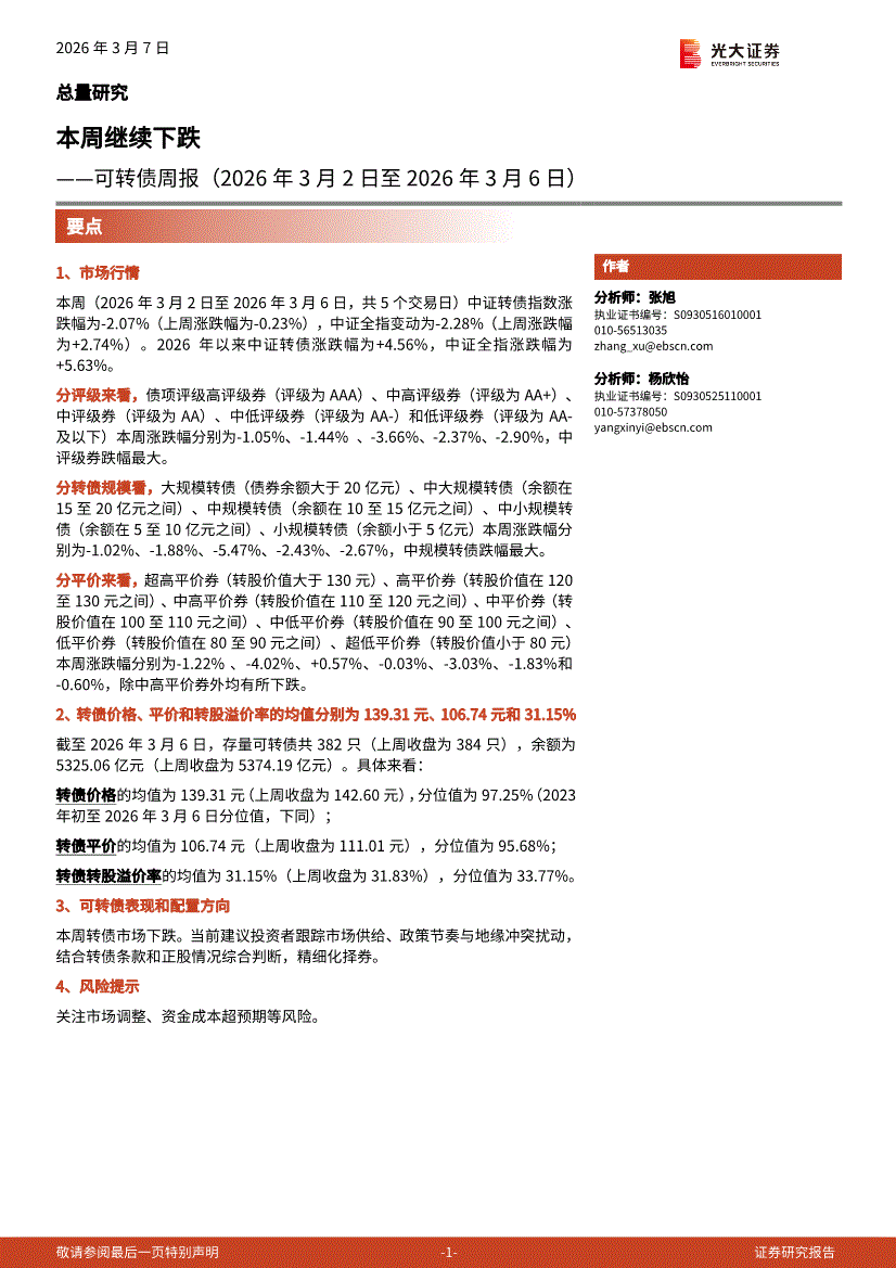 光大证券-可转债周报(2026年3月2日至2026年3月6日):本周继续下跌-260307