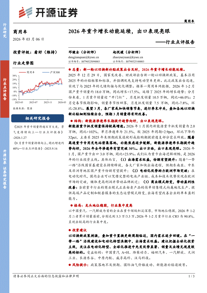 商用车行业:开源证券-商用车行业点评报告:2026年重卡增长动能延续,出口表现亮眼-260306