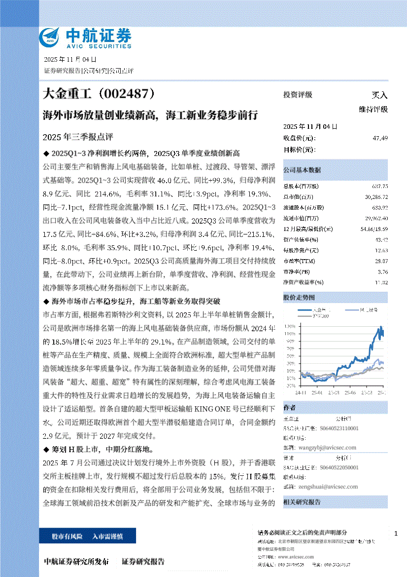 中航证券-大金重工-002487-2025年三季报点评:海外市场放量创业绩新高,海工新业务稳步前行-251104