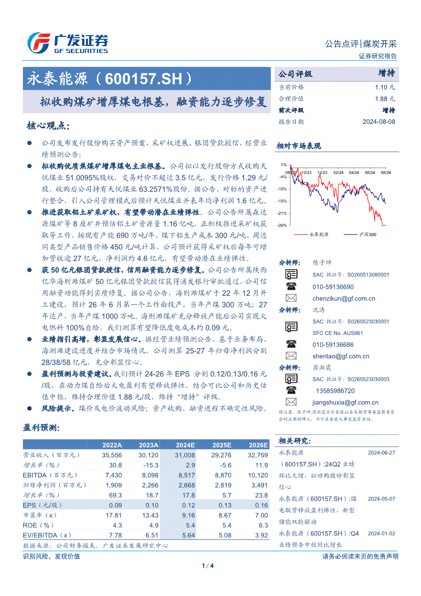 永泰能源:广发证券-永泰能源-600157-拟收购煤矿增厚煤电根基,融资能力逐步修复-240808