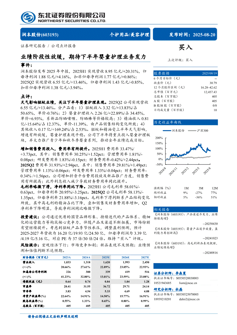 润本股份:东北证券-润本股份-603193-业绩阶段性放缓,期待下半年婴童护理业务发力-250820