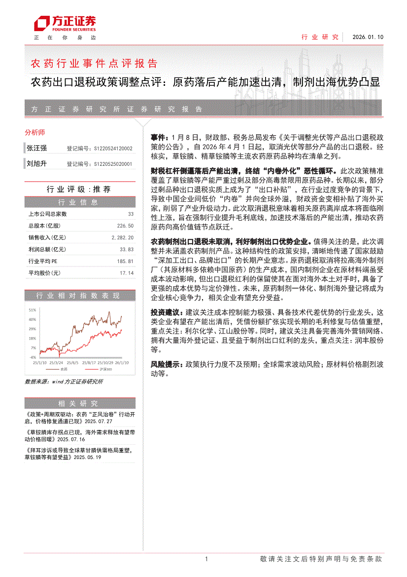 农药行业:方正证券-农药行业事件点评报告:农药出口退税政策调整点评,原药落后产能加速出清,制剂出海优势凸显-260110