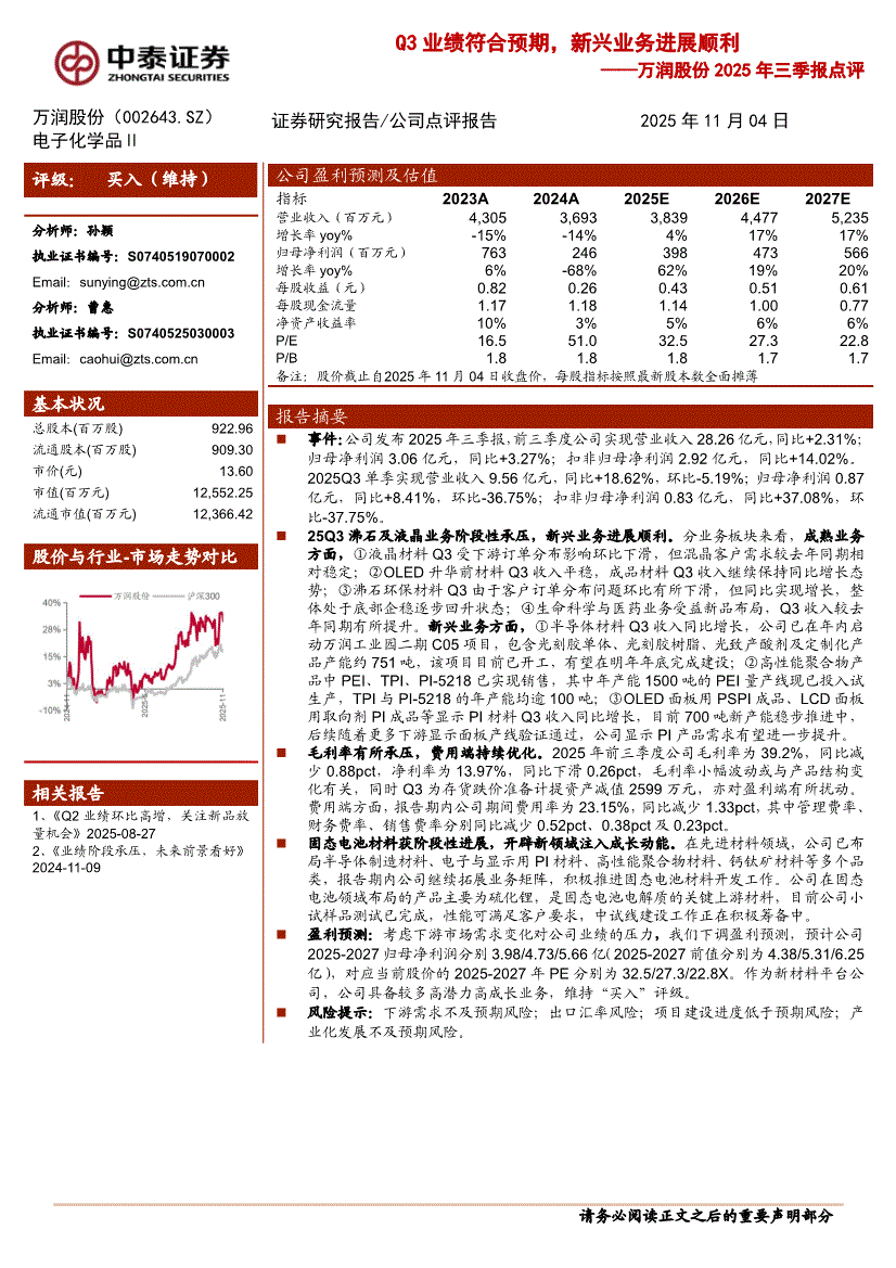 万润股份:中泰证券-万润股份-002643-2025年三季报点评:Q3业绩符合预期,新兴业务进展顺利-251104