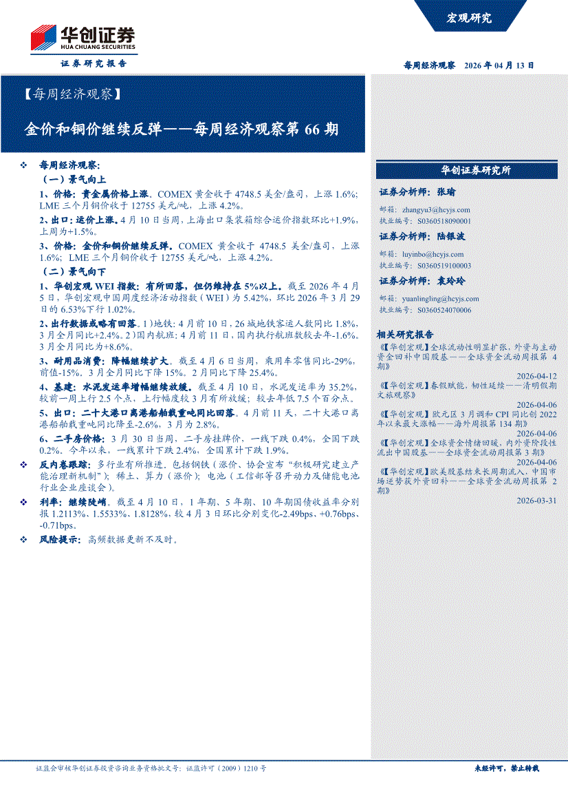 华创证券-【每周经济观察】金价和铜价继续反弹——每周经济观察第66期-260413