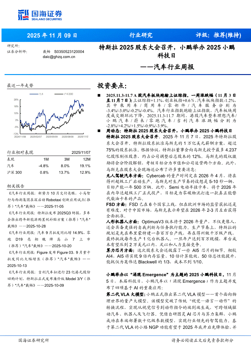 汽车行业:国海证券-汽车行业周报:特斯拉2025股东大会召开,小鹏举办2025小鹏科技日-251109