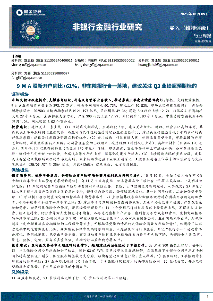 非银金融行业:国金证券-非银金融行业周报:9月A股新开户同比+61%,非车险报行合一落地,建议关注Q3业绩超预期标的-251008