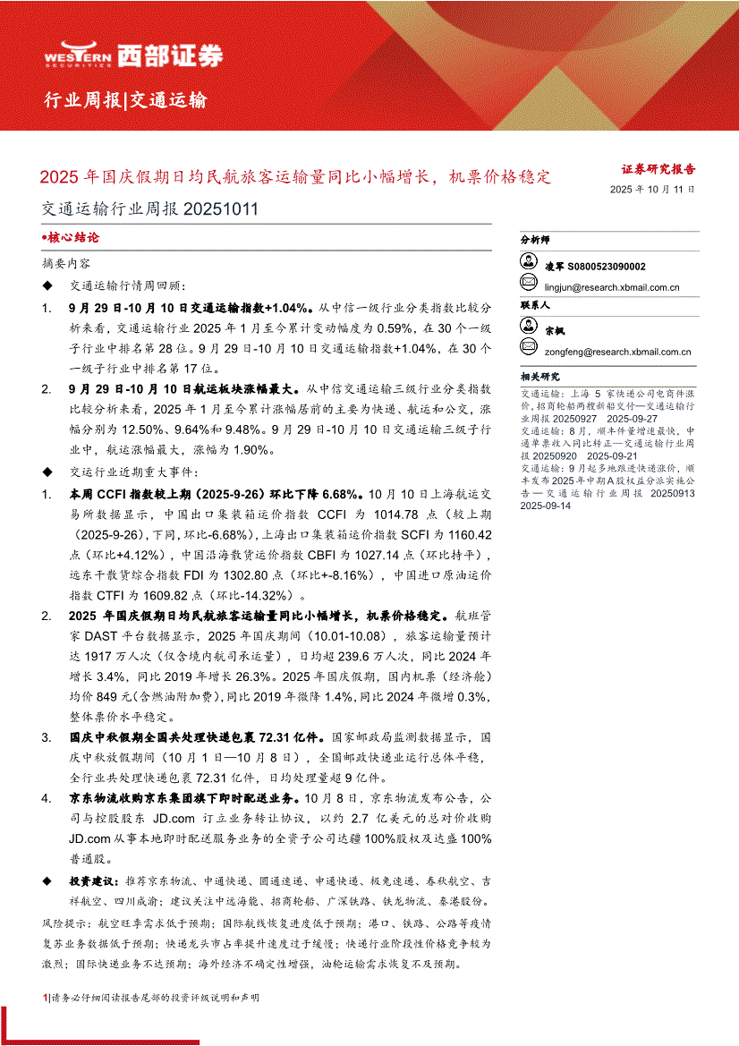 交通运输行业:西部证券-交通运输行业周报:2025年国庆假期日均民航旅客运输量同比小幅增长,机票价格稳定-251011