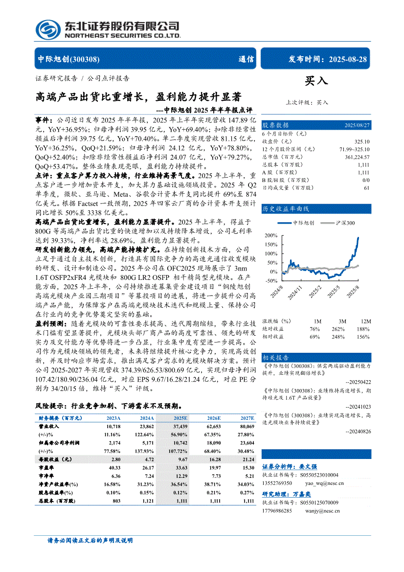 中际旭创:东北证券-中际旭创-300308-2025年半年报点评:高端产品出货比重增长,盈利能力提升显著-250828