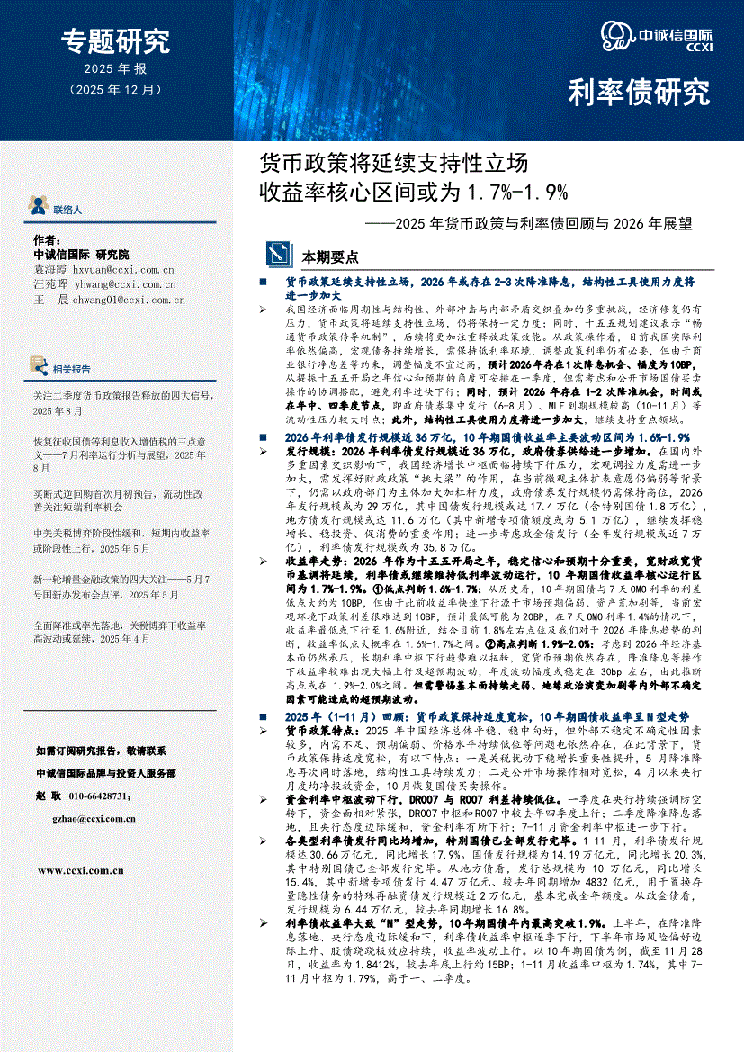 中诚信国际-2025年货币政策与利率债回顾与2026年展望:货币政策将延续支持性立场,收益率核心区间或为1.7%~1.9%-251218