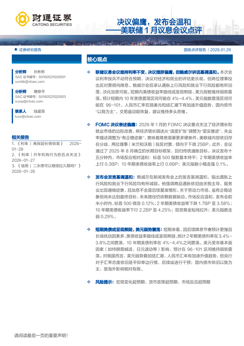 财通证券-美联储1月议息会议点评:决议偏鹰,发布会温和-260129