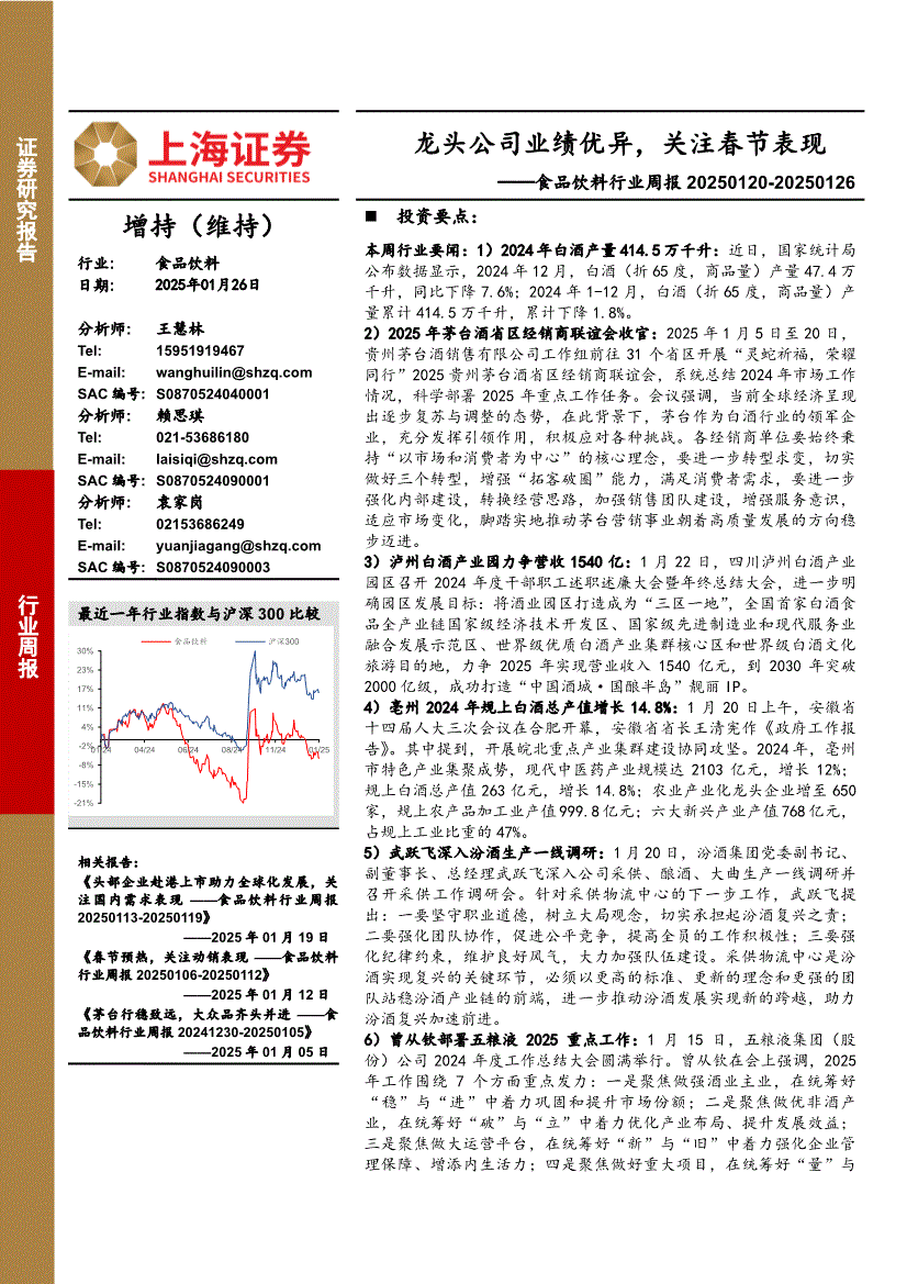 食品饮料行业:上海证券-食品饮料行业周报:龙头公司业绩优异,关注春节表现-250126