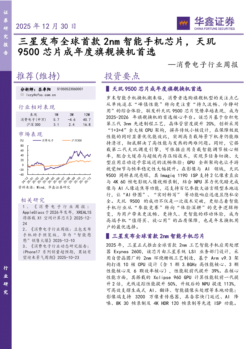 消费电子行业:华鑫证券-消费电子行业周报:三星发布全球首款2nm智能手机芯片,天玑9500芯片成年度旗舰换机首选-251230