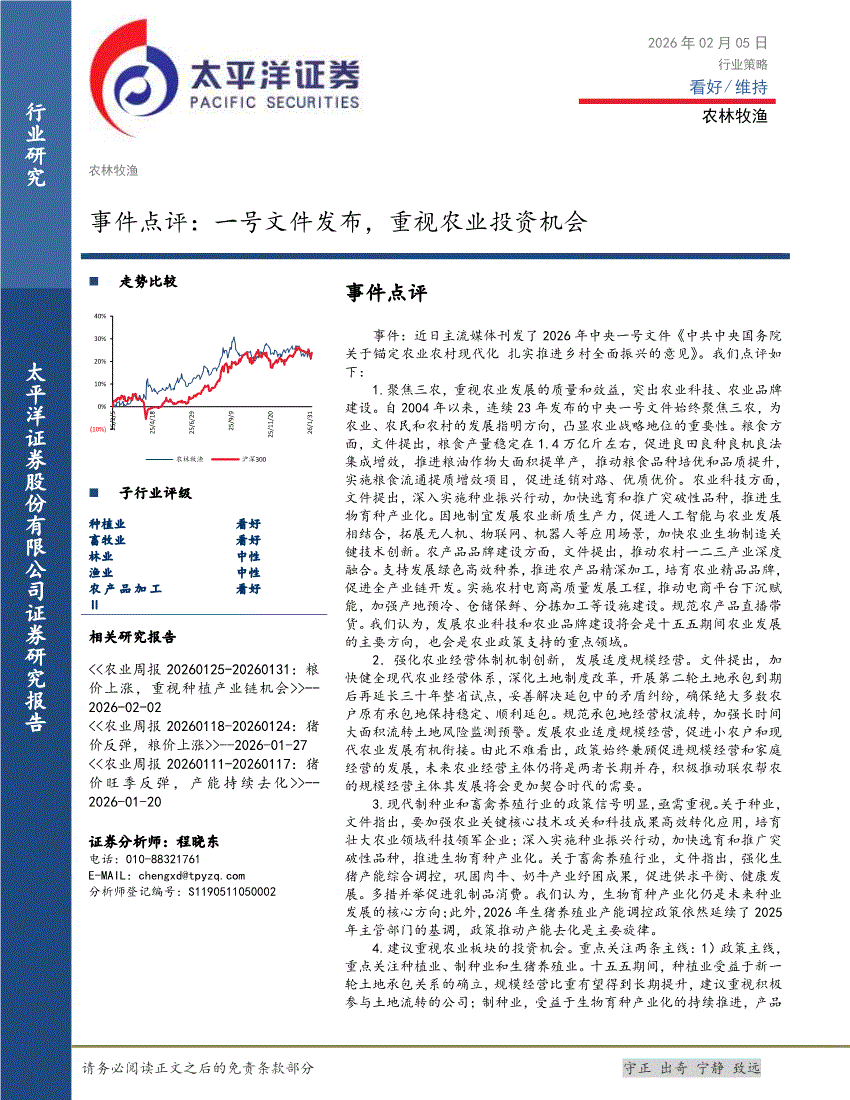农林牧渔行业:太平洋证券-农林牧渔行业事件点评:一号文件发布,重视农业投资机会-260205