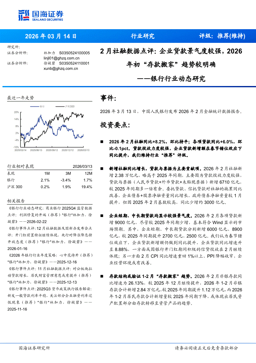 银行业:国海证券-银行行业动态研究:2月社融数据点评,企业贷款景气度较强,2026年初“存款搬家”趋势较明确-260314
