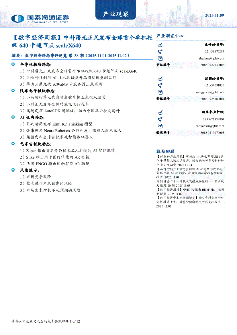 国泰海通证券-产业观察:【数字经济周报】中科曙光正式发布全球首个单机柜级640卡超节点scaleX640-251109