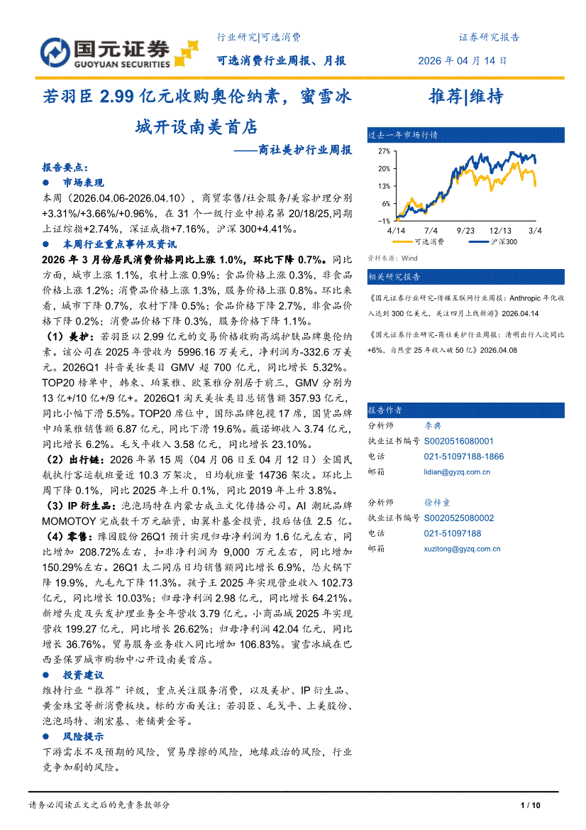 商社美护行业:国元证券-商社美护行业周报:若羽臣2.99亿元收购奥伦纳素,蜜雪冰城开设南美首店-260414