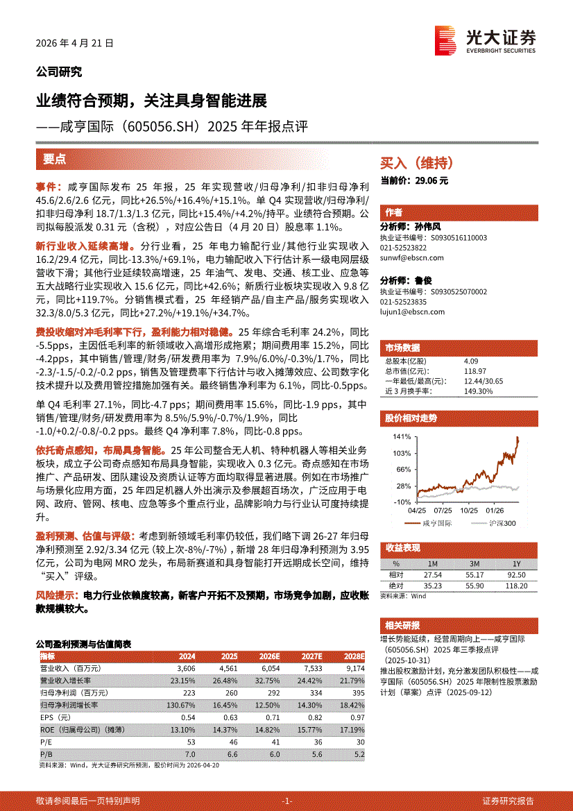 咸亨国际:光大证券-咸亨国际-605056-2025年年报点评:业绩符合预期,关注具身智能进展-260421