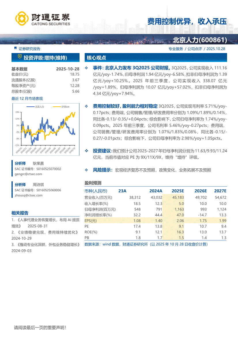 北京人力:财通证券-北京人力-600861-费用控制优异,收入承压-251028