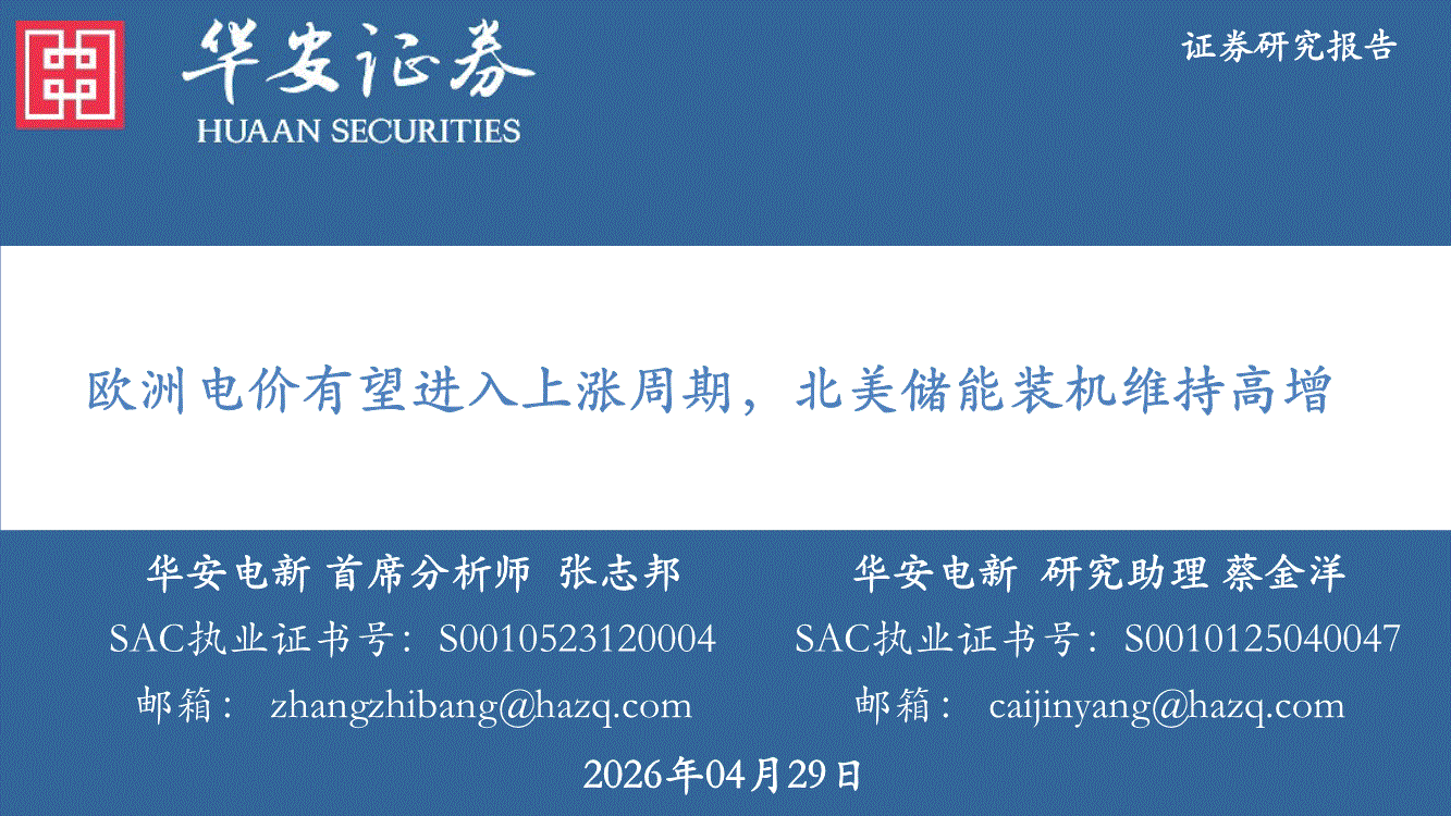 电力设备新能源行业:华安证券-电力设备新能源行业:欧洲电价有望进入上涨周期,北美储能装机维持高增-260429