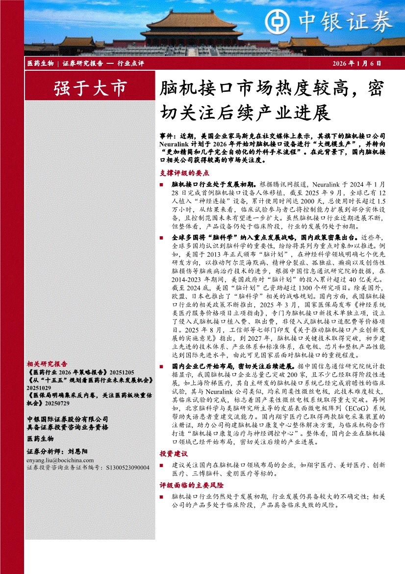 医药生物行业:中银国际-医药生物行业:脑机接口市场热度较高,密切关注后续产业进展-260106