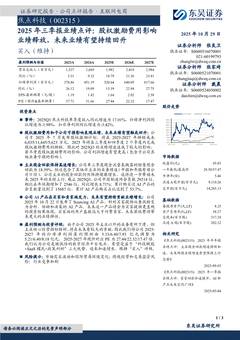 焦点科技:东吴证券-焦点科技-002315-2025年三季报业绩点评:股权激励费用影响业绩释放,未来业绩有望持续回升-251029