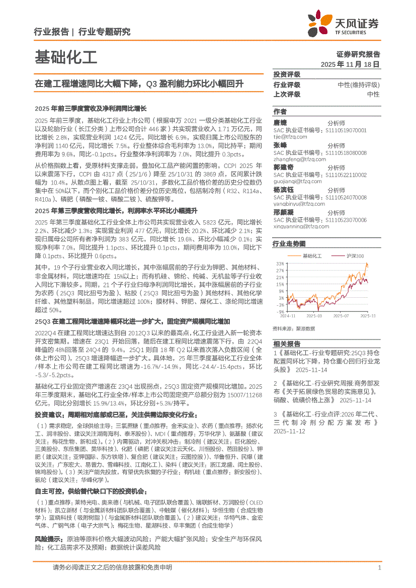 基础化工行业:天风证券-基础化工行业专题研究:在建工程增速同比大幅下降,Q3盈利能力环比小幅回升-251118