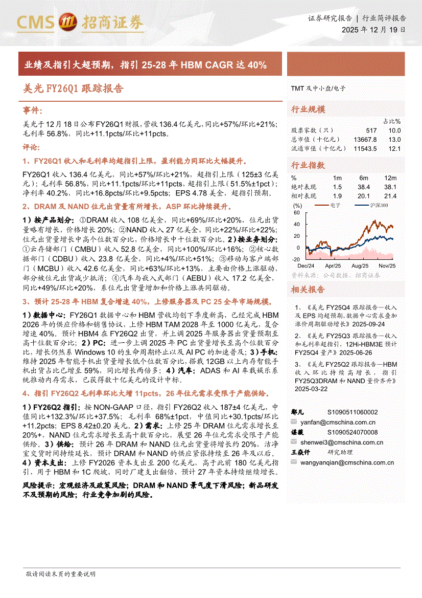 招商证券-电子行业FY26Q1跟踪报告:业绩及指引大超预期,指引25~28年HBMCAGR达40%-251219
