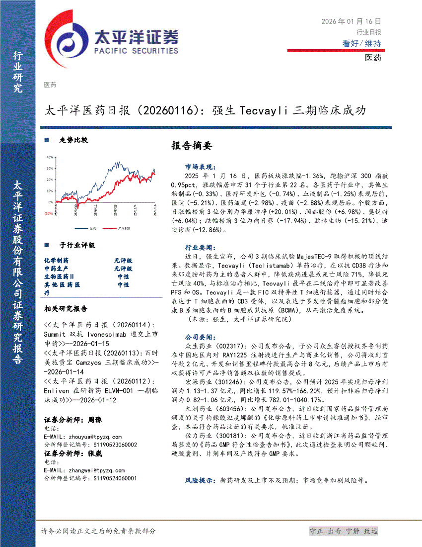 医药行业:太平洋证券-医药行业日报:强生Tecvayli三期临床成功-260116