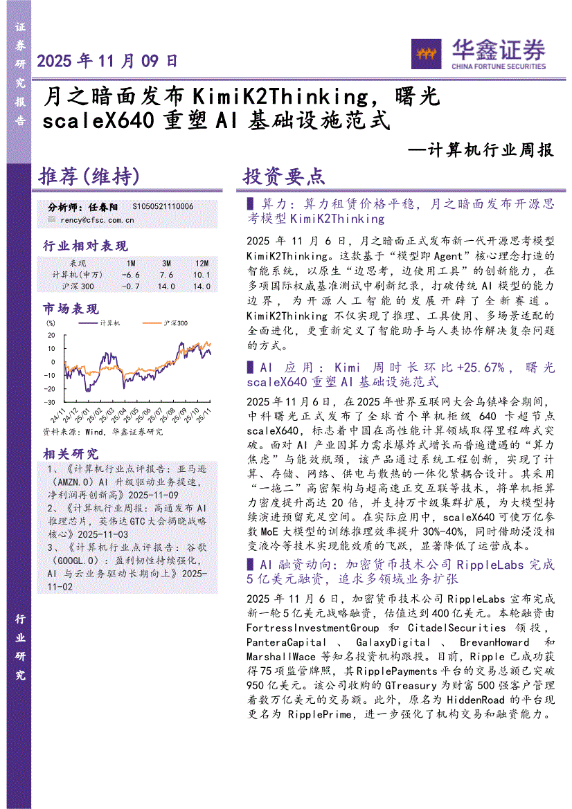 计算机行业:华鑫证券-计算机行业周报:月之暗面发布KimiK2Thinking,曙光scaleX640重塑AI基础设施范式-251109
