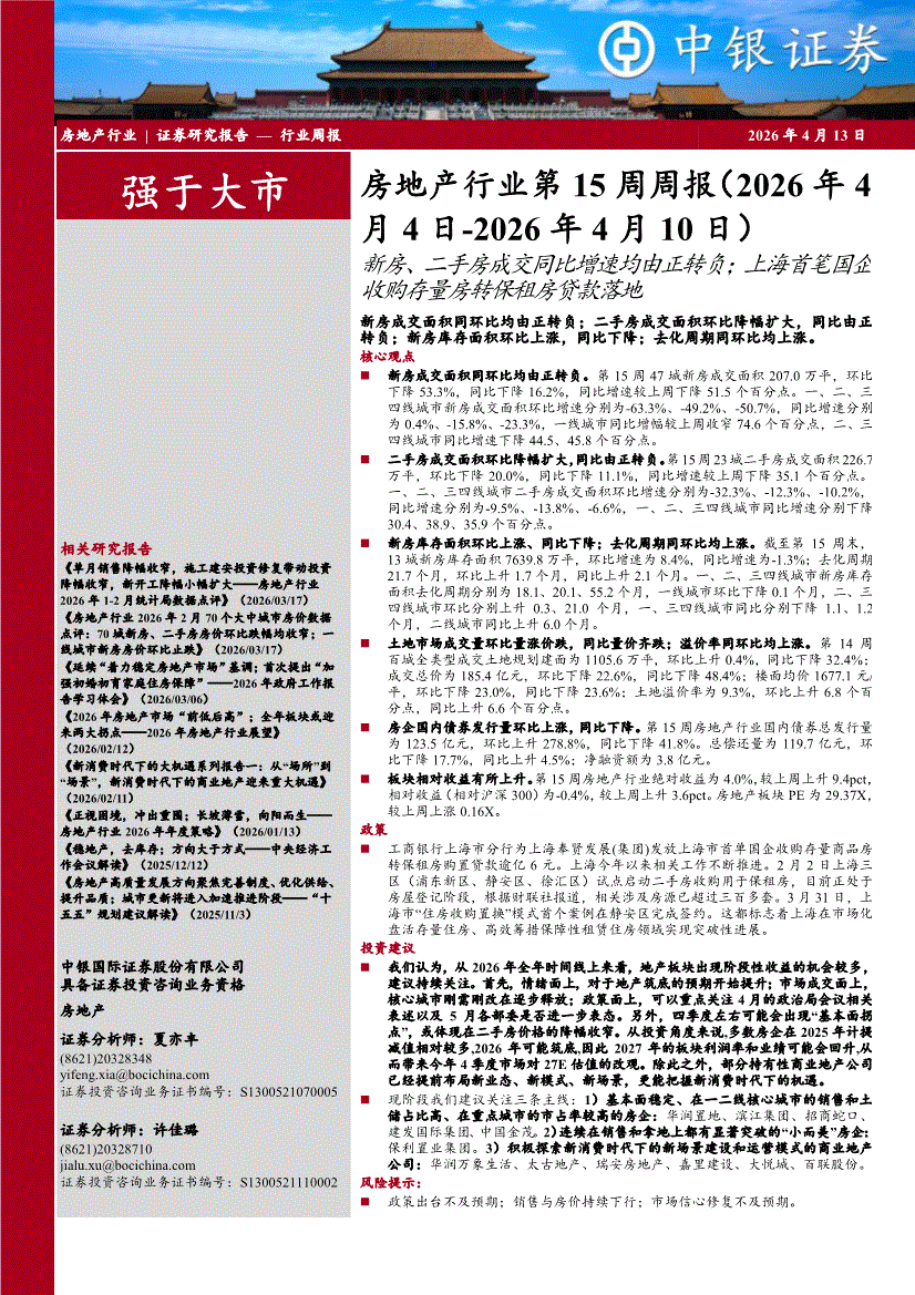 房地产行业:中银国际-房地产行业第15周周报(2026年4月4日~2026年4月10日):新房、二手房成交同比增速均由正转负;上海首笔国企收购存量房转保租房贷款落地-260413