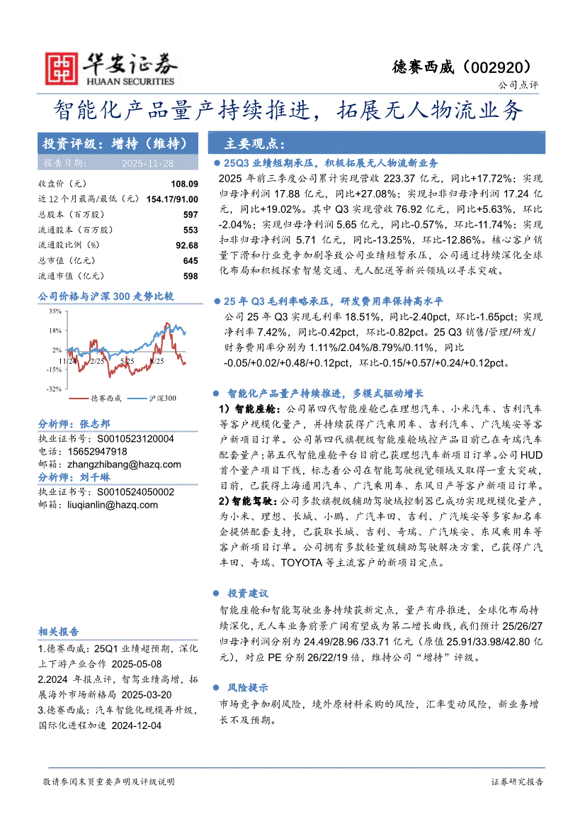 德赛西威:华安证券-德赛西威-002920-智能化产品量产持续推进,拓展无人物流业务-251128