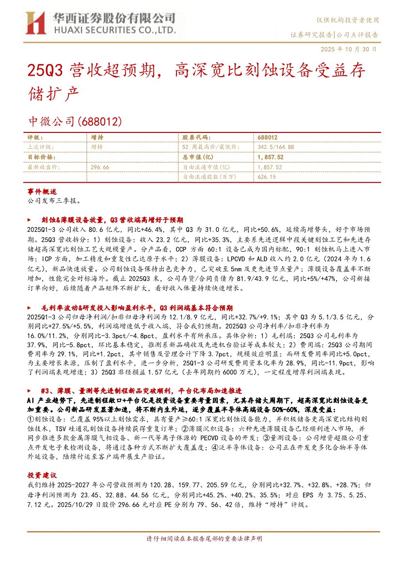 中微公司:华西证券-中微公司-688012-25Q3营收超预期,高深宽比刻蚀设备受益存储扩产-251030