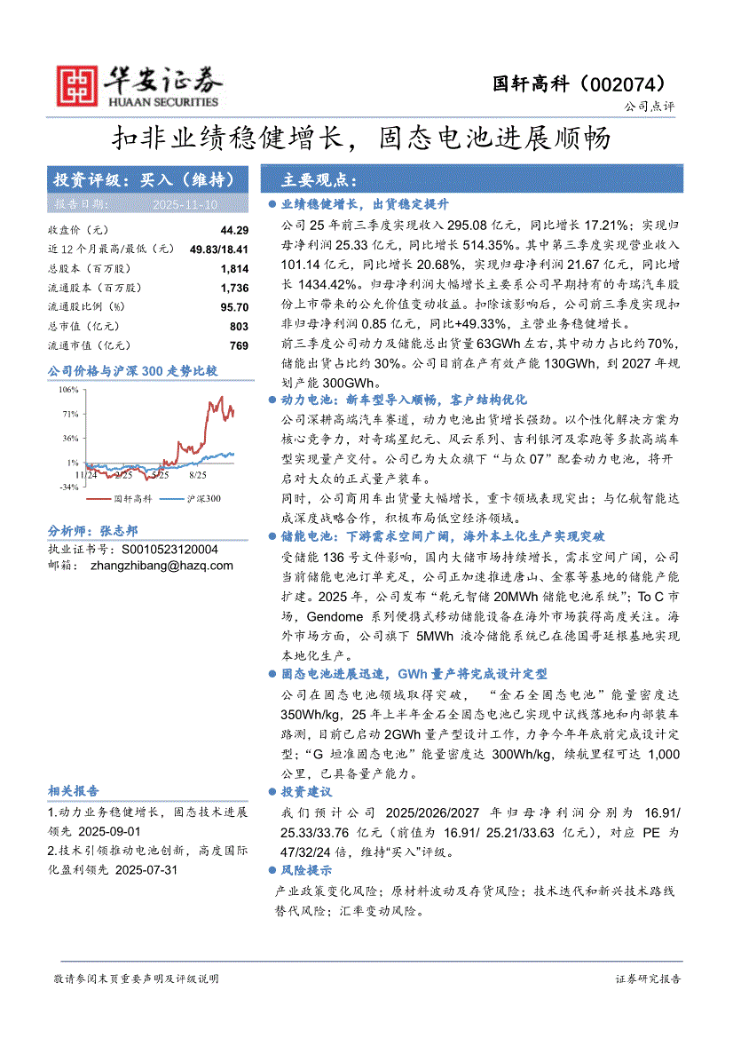 国轩高科:华安证券-国轩高科-002074-扣非业绩稳健增长,固态电池进展顺畅-251110