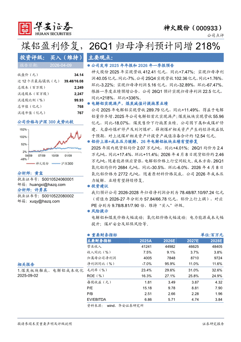 神火股份:华安证券-神火股份-000933-煤铝盈利修复,26Q1归母净利预计同增218%-260409